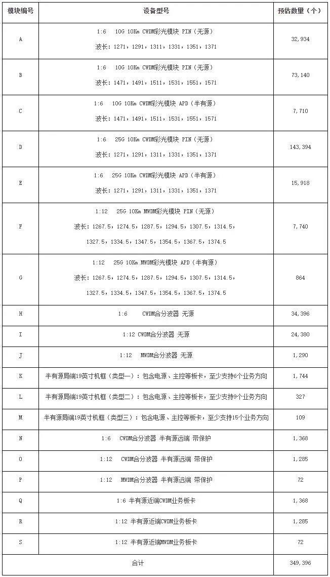 据了解,该项目于10月9号启动,本项目招标内容为开放式波分复用设备,包含彩光模块、合分波器、半有源局端机框、半有源局端业务板卡等共计349396个。本项目不划分标包,划分5个份额,拟引入不超过5家供应商。5个份额占比分别26%、23%、20%、17%、14%。