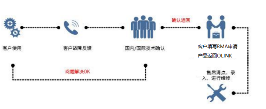 产品送修时,请填写RAM申请单(下载RMA申请单),告知产品型号、数量及故障状况,以电子邮件向欧凌克客服中心报修(Support@linkopto.com),经维修部确认后,通知您维修RMA授权号码。
